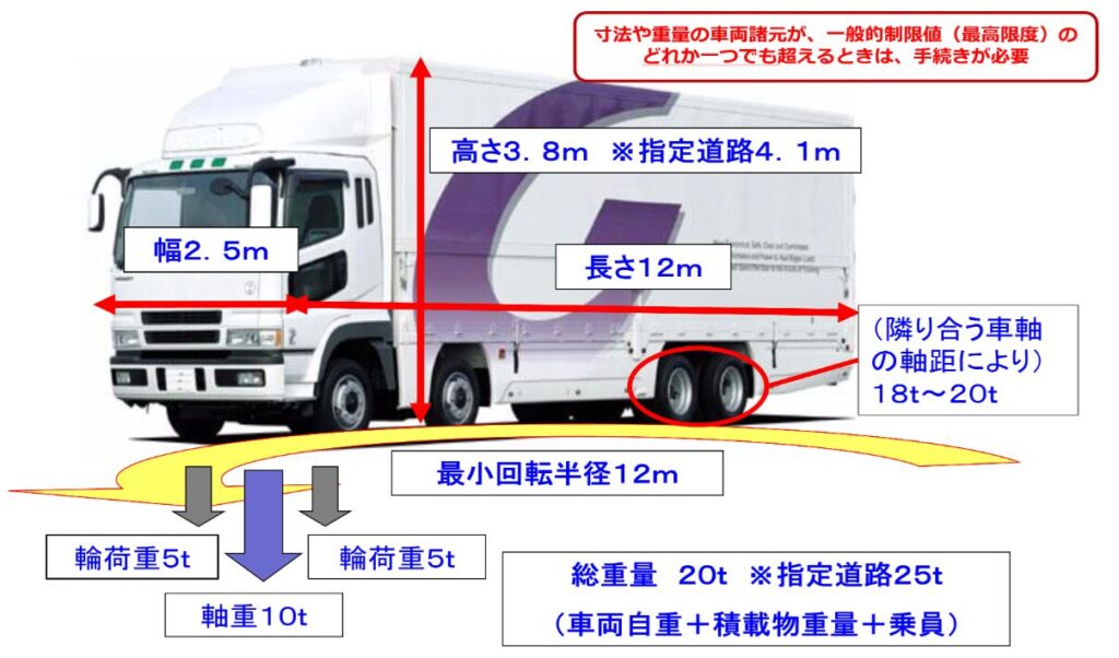 • 道路法に定める主要な一般的制限値は次のとおりです。